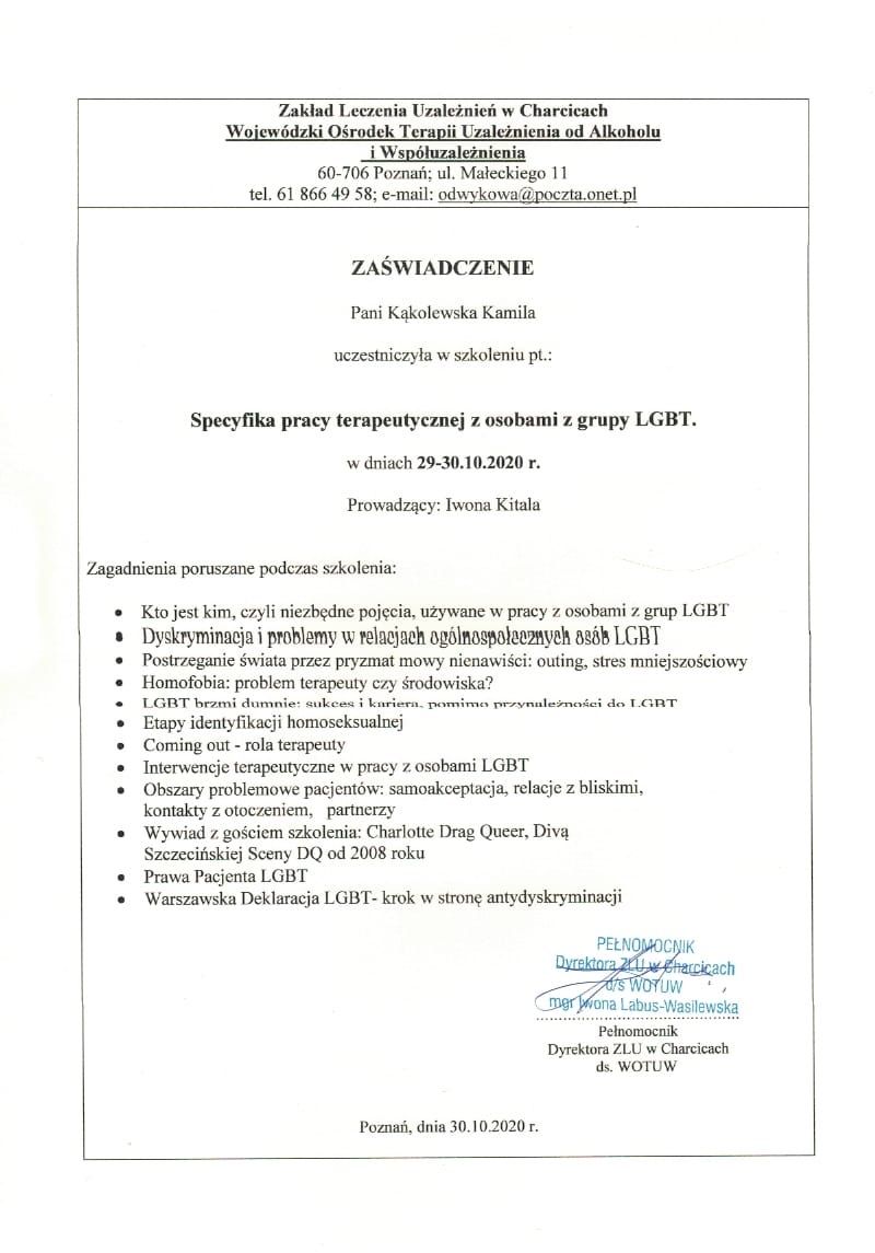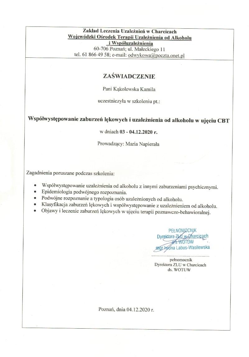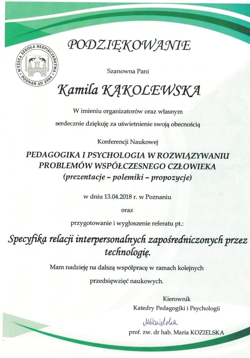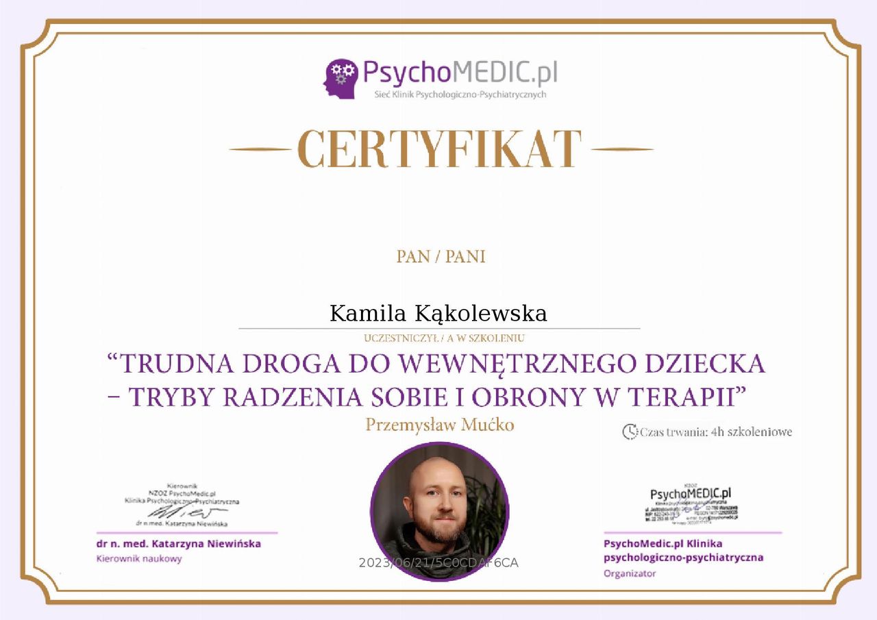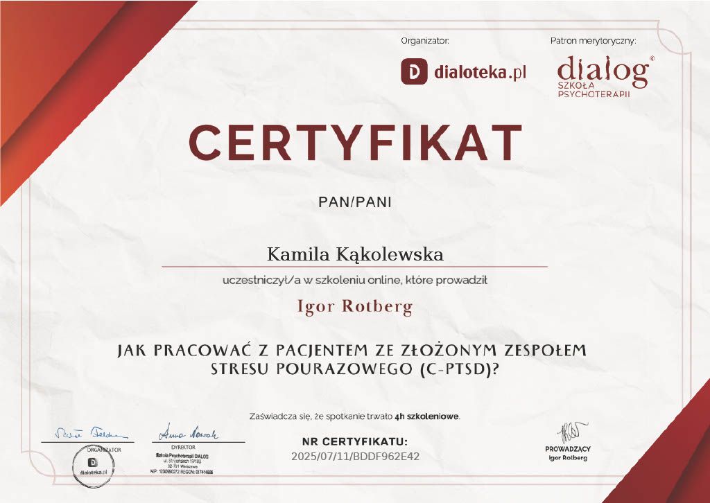 Nazywam się Kamila Kąkolewska, jestem magistrem psychologii, ukończyłam m.in specjalizację seksuologiczną. Pracuję z dorosłymi i młodzieżą, oferując bezpieczną i akceptującą przestrzeń do rozmowy o emocjach, relacjach i codziennych trudnościach.